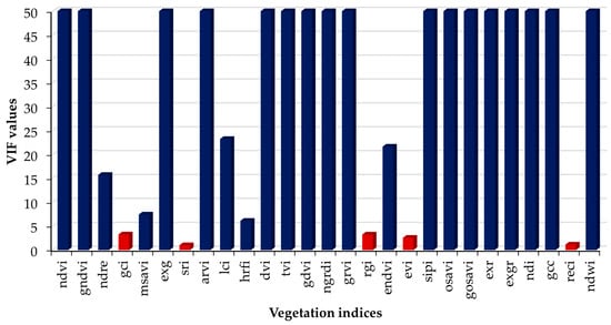 The VIF analysis highlighted several crucial VIs based on their VIF values (Figure 12). These included SRI, RECI, EVI, GCI, and RGI. Through correlation matrix analysis, the VIs including GCI, SRI, RGI, OSAVI, and RECI were selected based on their low correlation coefficients (Figure 13). Additionally, PCA revealed essential vegetation features, with the following prominent features including GOSAVI, NGRDI, GRVI, EVI, and RECI. Table 7 illustrates the selected VIs through different feature selection techniques.