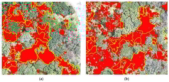 BLP prediction outcomes generated by RF model at region of interest in Bokarina study site: yellow polygons represent ground truth labels, regions highlighted in red denote prediction outcomes (a) training phase, (b) testing phase.