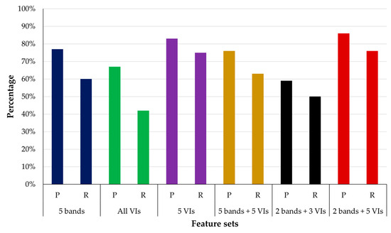 From the spectral signature plot analysis (Figure 10 and Figure 11), the top five features included two specific bands (NIR and red-edge) and five VIs (MSAVI, EVI, OSAVI, TVI, and DVI) were selected for ML model training. These features were identified based on spectral difference between two classes through spectral signatures.