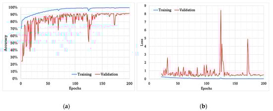 The models were evaluated and compared based on their performance metrics and ability to handle different classes effectively in a classification scenario. OA, precision, recall, F1–score, and Intersection over Union (IoU) were used to evaluate the model’s performance for the classification of BLP. Evaluation descriptors, including true positive (TP), false positive (FP), true negative (TN), and false-negative (FN), were used to determine the overall accuracy (Equation (1)), precision (Equation (2)), recall (Equation (3)), F1–score (Equation (4)), and IoU (Equation (5)).