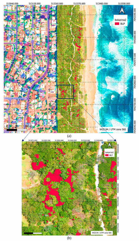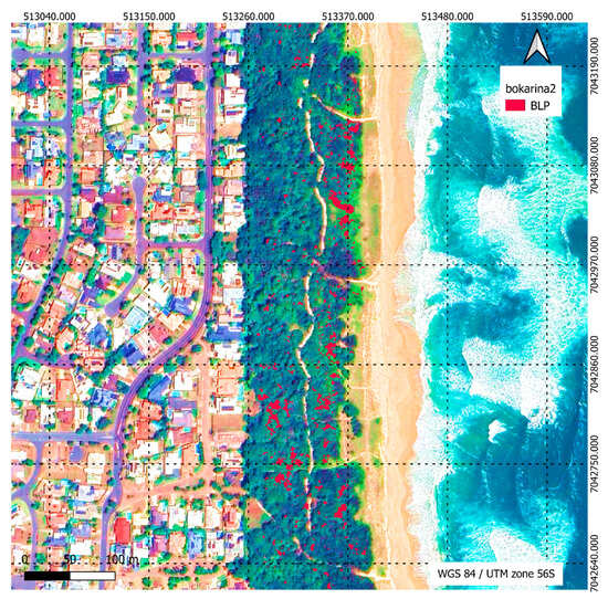One of the fundamental limitations of this study was the absence of ground control points (GCPs) during flight missions. RTK GNSS technology was used to capture data from the field, yet we faced difficulties in achieving perfect alignment between the RGB and MS imagery. Shadow and blur effects within the MS imagery introduced inaccuracies in the labelling process. In the densely vegetated environment of these study areas, we frequently encountered challenges from the overlapping canopies of various plant species. This overlap made it difficult to accurately label the target species and, in turn, reduced the overall accuracy of our models. The presence of other plant species that closely resembled the BLP added another layer of complexity to our research. Due to the growth form of BLP, it was possible to identify their trunks to see overall BLP populations in dense infestations during ground-truthing. However, mapping the canopy cover by ground distribution was difficult due to the growth form of BLP and accessibility of the sites. Additionally, in many of the foredune areas, native Horsetail she-oaks (Casuarina equisitifolia) obscure the aerial visibility of BLP.