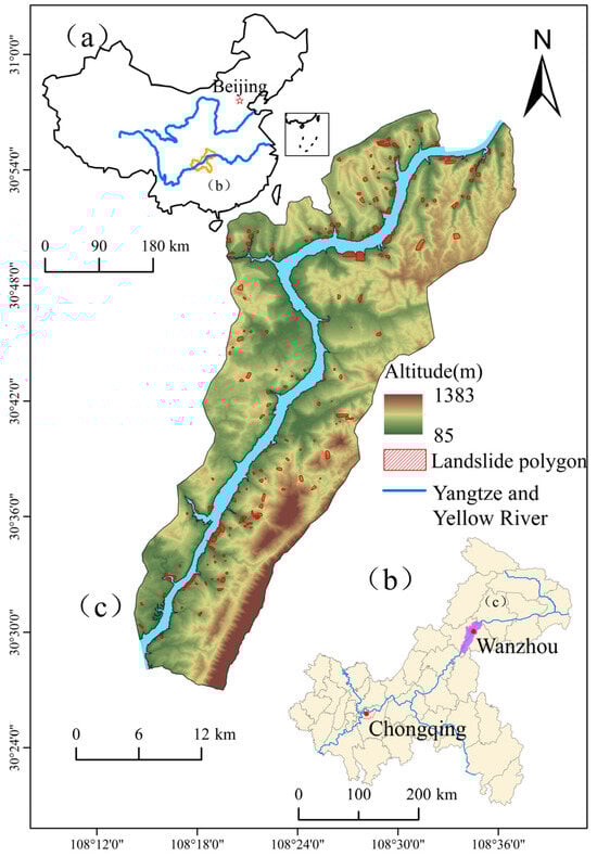 (a) Geographic location of the study area. (b) Chongqing, China; (c) landslides map in the study area.