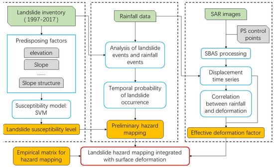 Rainfall is the main trigger of landslide deformation and landslide failure. For single landslides, the relationship between landslide deformation and rainfall was widely studied based on long-term monitoring data [30]. However, landslide deformation was seldom used for regional landslide hazard assessment. In the paper, the regional landslide deformation obtained from the time-series InSAR method was attempted for landslide hazard analysis. The preliminary landslide hazard assessment considering rainfall trigger factors was first obtained by probabilistic analysis. The final result of the landslide hazard assessment was corrected through the regional landslide surface deformation. The flowchart of landslide hazard assessment is shown in Figure 2. It is mainly divided into four steps: (1) Landslide inventory in the study area was obtained by remote sensing interpretation, field investigation and data collection. The predisposing factors of landslides were determined. The machine learning method (SVM) was adopted to predict the regional landslide susceptibility. (2) The historical rainfall data and landslide records were collected to analyze the temporal probability of landslide occurrence under different rainfall intensities. The preliminary result of landslide hazard evaluation was gained through the combination with the landslide susceptibility result. (3) The Sentinel-1 provides free SAR images for regional image interpretation. The integrated PS+SBAS time-series InSAR method was used to research the surface deformation. The correlation between surface deformation and rainfall was analyzed to provide an effective deformation factor. (4) The empirical matrix considering surface deformation and the preliminary landslide hazard result was constructed to get the final landslide hazard assessment result. In the study, the key is to find out the relationship between surface deformation and rainfall in a certain period and apply it to the landslide hazard assessment.