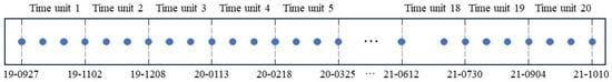 The period of Sentinel satellite images covers from 27 September 2019 to 10 October 2021. Considering the timing and revisit period of the Sentinel satellite, the period of approximately two years was divided into 20 time units. Each time unit is 36 days, and it is three cycles of Sentinel image, as shown in Figure 4. Based on collected rainfall data and the InSAR deformation results, correlation analysis between the accumulated rainfall and surface deformation in the area within these 20 time units was conducted.