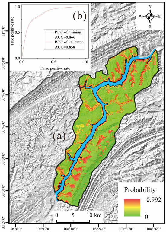 (a) Landslide susceptibility map produced by SVM; (b) the ROCs of SVM.