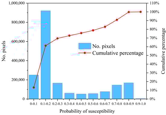 The Receiver Operating Characteristic (ROC) curve and the Area Under the ROC Curve (AUC) are used to evaluate the performance of the training model. The ROC curves of training and validation in this study are shown in Figure 5b. Their corresponding AUC values are 0.866 and 0.858, which are greater than 0.8. The statistical result of the susceptibility is shown in Figure 6. The mean and standard deviation (SD) of the susceptibility results are 0.3093 and 0.2693, respectively. The susceptibility probability is mainly distributed in 0.1–0.2 and 0.8–0.9, and the discrimination is good. These result, including standard deviation, proves that the trained model has a good performance and also verifies the reliability of landslide susceptibility assessment.