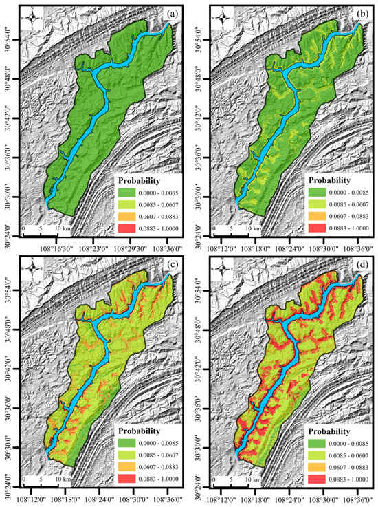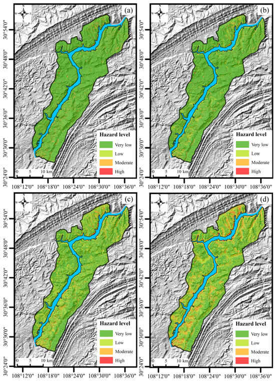 Final landslide hazard map for different rainfall conditions. (a) Rainfall intensity of 0; (b) rainfall intensity of 0–50; (c) rainfall intensity of 50–100; (d) rainfall intensity of larger than 100 mm.