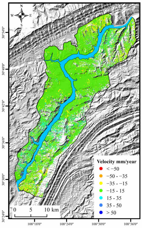 The ground control points were extracted from PS-InSAR and applied in the first inversion of SBAS-InSAR. In order to obtain more comprehensive surface deformation in the area, interferometric image pairs with better interferometric effects and more coherent areas were carefully selected for subsequent processing. The final annual surface deformation velocity is shown in Figure 8. The LOS velocities range from −97 mm/year to 70 mm/year. The areas where deformation velocity ranges from −10 mm/year to 10 mm/year account for 63.62% of the study area. For the south and northeast areas with inconsistent deformation points, the interpolation method was applied to obtain a comprehensive surface deformation rate in these areas.