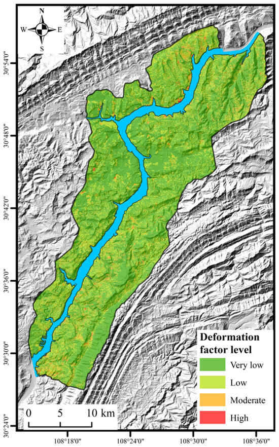 According to the landslide hazard assessment method described above (Equation (3)), the annual surface deformation rate and the processed correlation coefficient are normalized. They are equivalently summed to obtain the final deformation factor map (Figure 10). The deformation factors were divided into four levels: very low-Df1 (0~0.1), low-Df2 (0.1~0.3), moderate-Df3 (0.3~0.6) and high-Df4 (>0.6). Based on the proposed landslide hazard assessment matrix, the final landslide hazard map was obtained considering surface deformation and rainfall, which is shown in Figure 11.