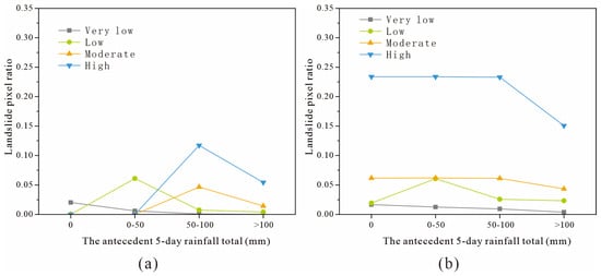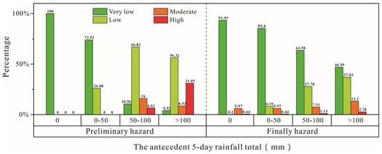 Figure 12 presented statistical results on the preliminary and final landslide hazard. There is a close relationship between rainfall intensity and landslide hazard degree. With increasing rainfall, the areas with low hazards decrease while those with high hazards increase. In the preliminary landslide hazard assessment, 31.05% of pixels were at a high hazard level when the 5-day antecedent total rainfall exceeded 100 mm, while only 4.11% of pixels were at a very low hazard level. However, no area was at a high hazard level when the 5-day antecedent total rainfall was less than 50 mm.