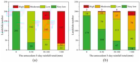 For small rainfall intensity, the overall landslide hazard in the preliminary hazard assessment was low, and the proportion of pixels with medium and high landslide hazard levels were both 0. However, there were still some areas with medium or high hazard levels in the final landslide hazard assessment. The number of landslides was counted at different landslide hazard levels, shown in Figure 13. In the preliminary landslide hazard assessment (Figure 13a), the landslide hazard levels undergo drastic changes with the increase in rainfall intensity. When the 5-day antecedent rainfall total was 0, the hazard level of all landslides was very low. When the 5-day antecedent total rainfall would exceed 100mm, the majority of landslides had a high hazard level. In the final landslide hazard assessment (Figure 13b), the number of landslides with the increase in rainfall intensity shows a gradual growth trend at low, moderate and high hazard levels.
