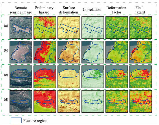 Comparison of preliminary hazard, surface deformation and final landslide hazard. The (a–d) represent four different typical regions.