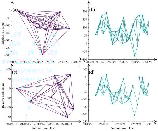 Time–position plots: (a) ALOS-2 ascending; (b) Sentinel-1 ascending; (c) ALOS-2 descending; (d) Sentinel-1 descending.