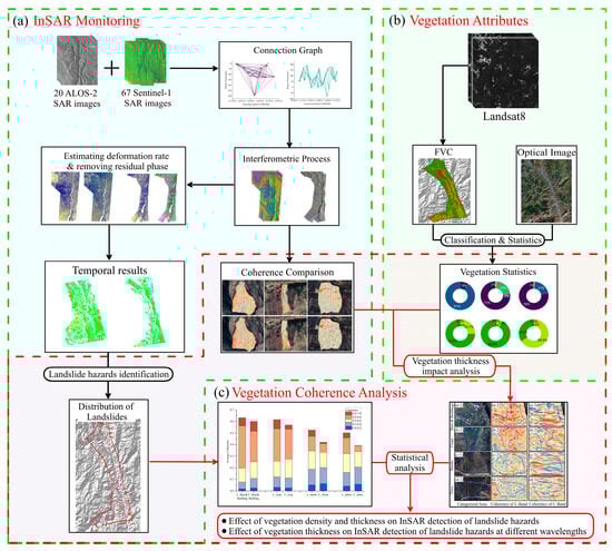 Technology flowchart: (a) InSAR monitoring; (b) vegetation information statistics; (c) vegetation coherence analysis.