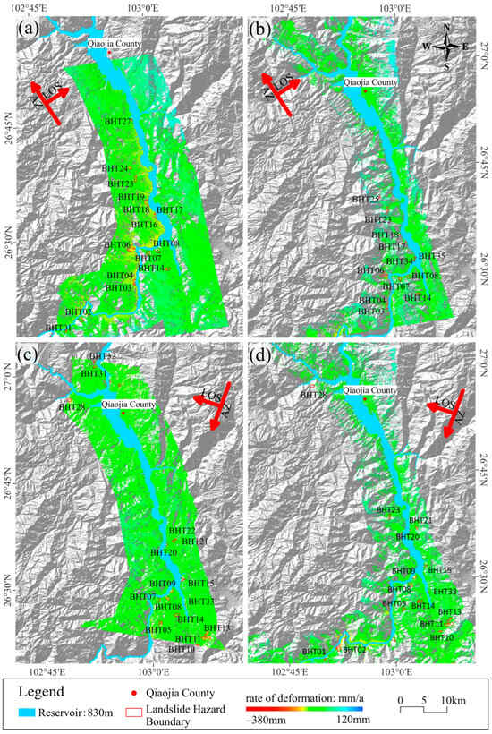Displacement velocity map. (a) ALOS-2 ascending; (b) Sentinel-1 ascending; (c) ALOS-2 descending; (d) Sentinel-1 descending.