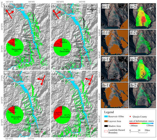 Geometric distortion distribution. (a) ALOS-2 ascending; (b) Sentinel-1 ascending; (c) ALOS-2 descending; (d) Sentinel-1 descending; (e-1–h-1) geometric distortion distribution of BHT06 from ALOS-2 and Sentinel-1; (e-2–h-2) effective point distribution of BHT06 from ALOS-2 and Sentinel-1.