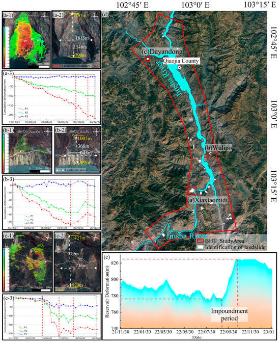 Typical landslide profile (a-1–c-1) effective point distribution of BHT06-Xiaxiaomidi, BHT20-Caizidi and BHT28-Dayandong; (a-2–c-2) size of BHT06-Xiaxiaomidi, BHT20-Caizidi and BHT28-Dayandong; (a-3–c-3) deformation curve of monitoring point of BHT06-Xiaxiaomidi, BHT20-Caizidi and BHT28-Dayandong; (a,d) overview of the distribution of landslide hazards; (e) reservoir deformation.