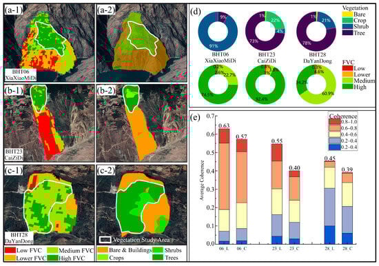 Coherence and vegetation cover overview: (a-1–c-1) fractional vegetation cover of BHT06-Xiaxiaomidi, BHT20-Caizidi and BHT28-Dayandong; (a-2–c-2) distribution of vegetation classification of BHT06-Xiaxiaomidi, BHT20-Caizidi and BHT28-Dayandong; (d) percentage analysis of vegetation types in the study area; (e) percentage analysis of vegetation cover classes in the study area.