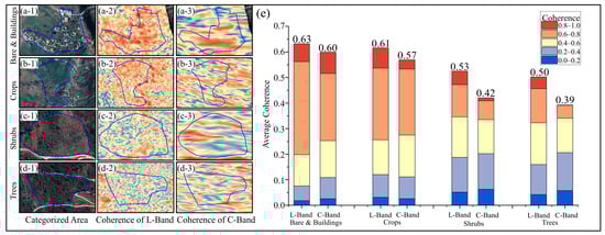 Taking into account the volume scattering decorrelation caused by vegetation, and under similar vegetation surface scattering conditions, different vegetation types with varying thicknesses were compared in four typical regions, as shown in Figure 8(a-1,a-2,a-3,b-1,b-2,b-3,c-1,c-2,c-3,d-1,d-2,d-3). It can be observed from the comparison that, under similar vegetation cover, the contribution of the vegetation volume scattering decorrelation component follows the pattern of trees > shrubs > crops, reflecting the influence of vegetation thickness. The coherence of the four vegetation types in the three regions was statistically analyzed as shown in Figure 8e, The coherence of the four types followed a pattern of buildings and bare ground (0.62) > crops (0.59) > shrubs (0.53) > trees (0.45). Among the four vegetation types, L-band interferograms exhibited greater coherence compared to C-band interferograms. Figure 8e shows that the average coherence of the L-band and C-band increases with the thickness of vegetation. The pattern of the average coherence is buildings and bare ground (0.03) < crops (0.04) < shrubs (0.11) = trees (0.11). In areas bare of vegetation or with the lowest crop cover, the proportions of coherence values for both bands were similar, with mean values greater than 0.58. In areas with trees and shrub coverage, L-band interferograms showed better coherence performance, both in terms of overall coherence and the proportion of high coherence values, compared to C-band interferograms.