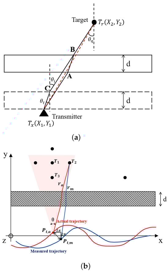 (a) Through-wall signal propagation path model, (b) through-wall detection model in the presence of trajectory deviation.