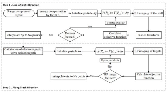 Similar to the estimation of the trajectory deviation in the line-of-sight direction as introduced in Section 3.1, the trajectory deviation vector along the track is optimized with the PSO algorithm with image contrast as the objective function. It is unnecessary to be aware of the precise location of the target. However, to precisely calculate the slant range of each grid point behind the wall using Equation (3), it is necessary to identify both the dielectric constant and thickness parameters of the wall priorly. The flowchart of the algorithm is displayed in Figure 5.