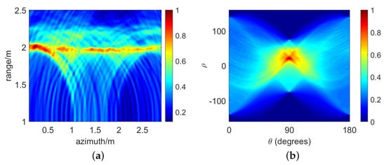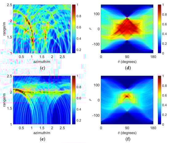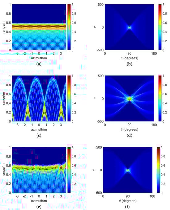 Figure 7 shows the autofocus result of the wall. The BP imaging results are shown in Figure 7a, Figure 7c, and Figure 7e for the cases of no LOS direction trajectory deviation, with sinusoidal trajectory deviation, and when the trajectory deviation has been estimated and compensated for by the proposed algorithm, respectively. The corresponding Radon transform results are shown in Figure 7b,d,f.