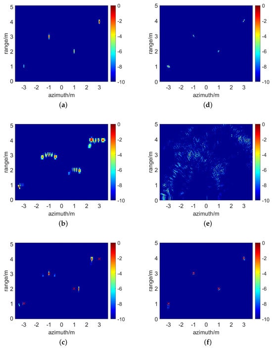 Figure 8 shows the autofocus result of targets behind the wall. The RD images using the comparison algorithm in the absence of along-the-track deviation, in the presence of deviation and after autofocus processing are represented by Figure 8a, Figure 8b, and Figure 8c, respectively. The BP images of the proposed algorithm in the absence of trajectory deviation, in the presence of deviation, and after autofocusing processment are represented by Figure 8d, Figure 8e, and Figure 8f, respectively.