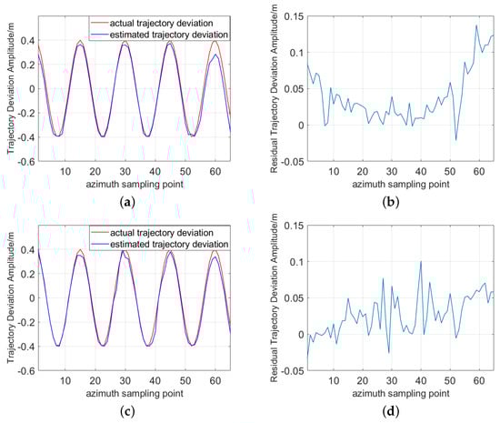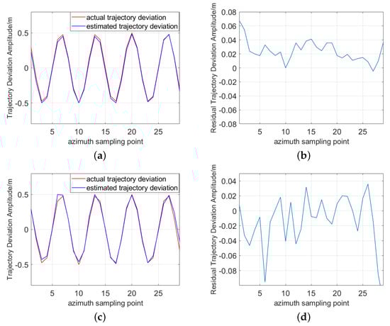 The estimations of the trajectory deviation are shown in Figure 9. The estimated results and residuals of the LOS direction deviation are represented by Figure 9a and Figure 9b, respectively. It is evident that the estimated value is consistent with the true value, and the residuals fall in the range of 0.15 m. The accuracy reaches the range resolution level, and the Root Mean Square Error (RMSE) is 0.0528 m. The estimated results of the along-the-track deviation are shown in Figure 9c and Figure 9d, respectively. The accuracy is also at the level of range resolution, with an RMSE of 0.038 m.