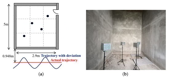 Figure 10 shows the experimental environment. Four angle reflectors with side lengths of 20 cm are placed inside a room of size 2.9 × 5 m as detection targets. The radar moves along the wall outside the room, following a straight line trajectory. The wall is composed of brick and concrete, with a thickness of 120 mm and a relative dielectric constant of 4.5. A vector network analyzer of Keysight Technologies N9923A is used to transmit the step frequency signal during the experiment. The actual position of the radar is unknowable due to the unavoidable measurement error regardless of the experimental method in practice. To determine the actual trajectory of the radar in the experiment, the radar is projected on the ground. We calibrate the projection of the radar on the ground to minimize measurement errors. A total of 29 sampling points are calibrated.