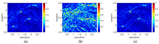 Experimental results after the compensation of deviation in the LOS direction. (a) BP image of targets without along-the-track deviation, (b) BP image of targets with along-the-track deviation, (c) BP image of targets after compensation for both LOS and along-the-track deviations.