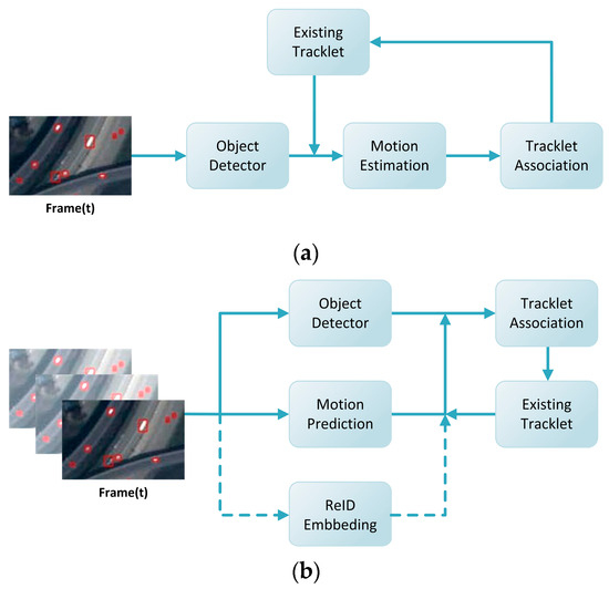 In recent years, the emergence of large video satellite tracking datasets such as VISO [14], AIR-MOT [15], and SAT-MTB [16] has greatly advanced the development of deep learning-based (DL) MOT methods. Various tracking methods proposed new insights in terms of feature enhancement, association logic, trajectory recovery, and multi-task training strategies. Advanced online MOT methods can currently be classified into two-stage tracking-by-detection (TBD) and one-stage joint detection and tracking (JDT) [17]. Figure 3 illustrates the general architecture sketch of both the TBD and JDT methods. The TBD paradigm associates the detection results from an independent detector with trajectories using various similarity metrics. In recent years, deep learning-based object detectors [18,19] have been rapidly developed, leading to significant improvements in the TBD paradigm. Maher, et al. [20] used YOLO v2 [21] to obtain aircraft heads, tails, and full bodies and generate heading state parameter updates of the classic SORT [22] algorithm using the Karman filter [23]. Similarly, Wang, et al. [24] achieved the real-time tracking of multiple moving ships using three consecutive frames as an input to the YOLO v3 [25] network. Xiao, et al. [26] proposed the DSFNet, which uses lightweight 3D convolution to extract dynamic cues from multiple frames. Li, et al. [27] designed the D-RGB network based on the two-stage F-RCNN [28] model. The network subtracts the features from adjacent frames to extract the ROIs for second-stage detection in the RCNN.