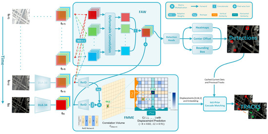 - For detection, we devised a lightweight feature aggregation wrapper (FAW) module, which utilizes sets of deformable convolutions (DCN) [41] to extract correlated information in different channel dimensions from the feature groups of multiple frames. All of the information is then employed to enhance the feature representation of the current frame. For tracking, we employed an end-to-end learnable feature-mapping motion estimation (FMME) module to estimate the displacement of individual objects. Regarding object-trajectory matching, we designed an IoU-prioritized cascaded matching scheme that effectively utilizes both localization and appearance information to generate and manage object trajectories;