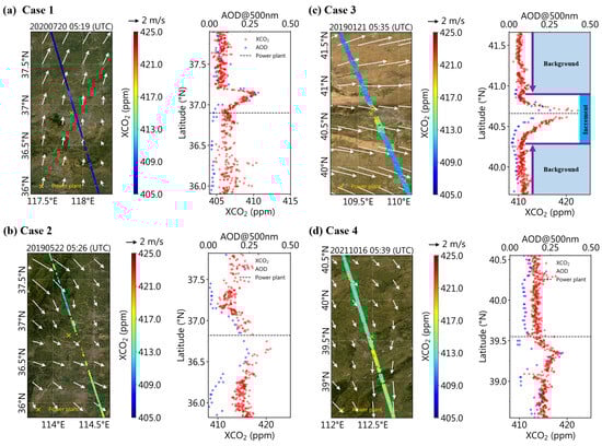 XCO2 (the column-averaged dry-air mole fraction of carbon dioxide) and AOD (aerosol optical depth) at 500 nm over four different power stations: (a) Case 1: Zouping Huineng Thermo Power Co., Ltd. (b) Case 2: Datang Wuan Power Generation Co., Ltd. (c) Case 3: Huaneng Baotou No. 1 power station Co., Ltd. (d) Case 4: Shanxi Shentou power station Co., Ltd. Wind speed and direction are overplotted to indicate the meteorological conditions around the power stations. Each exact location of the power station is marked in yellow and centered on the color maps. The dotted line represents the latitude position of the power plant. A schematic of the background and increment is illustrated in Case 3.