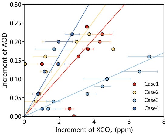 Increments of AOD (aerosol optical depth) and XCO2 (the column-averaged dry-air mole fraction of carbon dioxide) for the four cases, as introduced in Figure 1. Colored lines indicate linear fitting results.