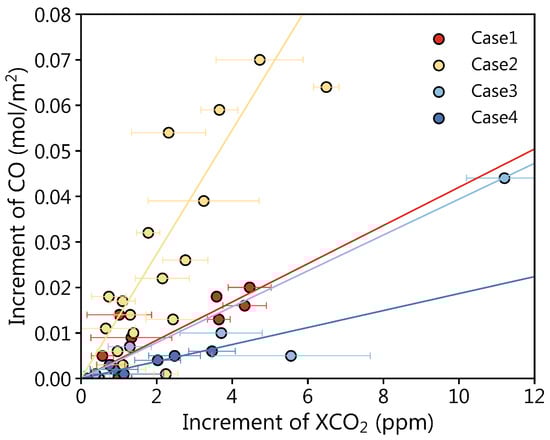 Increments of CO (carbon monoxide) and XCO2 (the column-averaged dry-air mole fraction of carbon dioxide) for the four cases. Colored lines indicate linear fitting results.