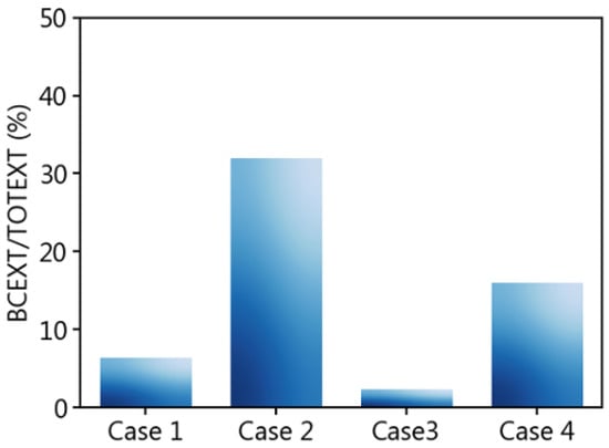 In Figure 4, the ratio between BCEXT and TOTEXT is presented, as calculated from the MERRA-2 dataset. Interestingly, the cases with high (low) CO/XCO2 ratios do not align consistently with those that have high (low) BCEXT/TOTEXT ratios. Case 2 stands out with the highest BCEXT/TOTEXT ratio, and also with the highest CO/XCO2 ratio. Case 1 surpasses case 3 in BCEXT/TOTEXT and in CO/XCO2. The exception is case 4, which, based on the CO/XCO2 ratio metric, indicates the most complete combustion. However, according to the BCEXT/TOTEXT ratio metric, case 4’s result is higher than that of cases 1 and 3.