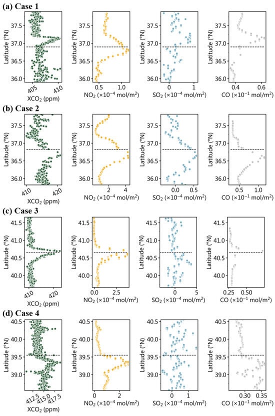 Comparisons of the typical chemical compositions, XCO2 (the column-averaged dry-air mole fraction of carbon dioxide), NO2 (nitrogen dioxide), SO2 (sulfur dioxide), and CO (carbon monoxide) emitted by the four power plants. The dotted line represents the latitude position of the power plant.