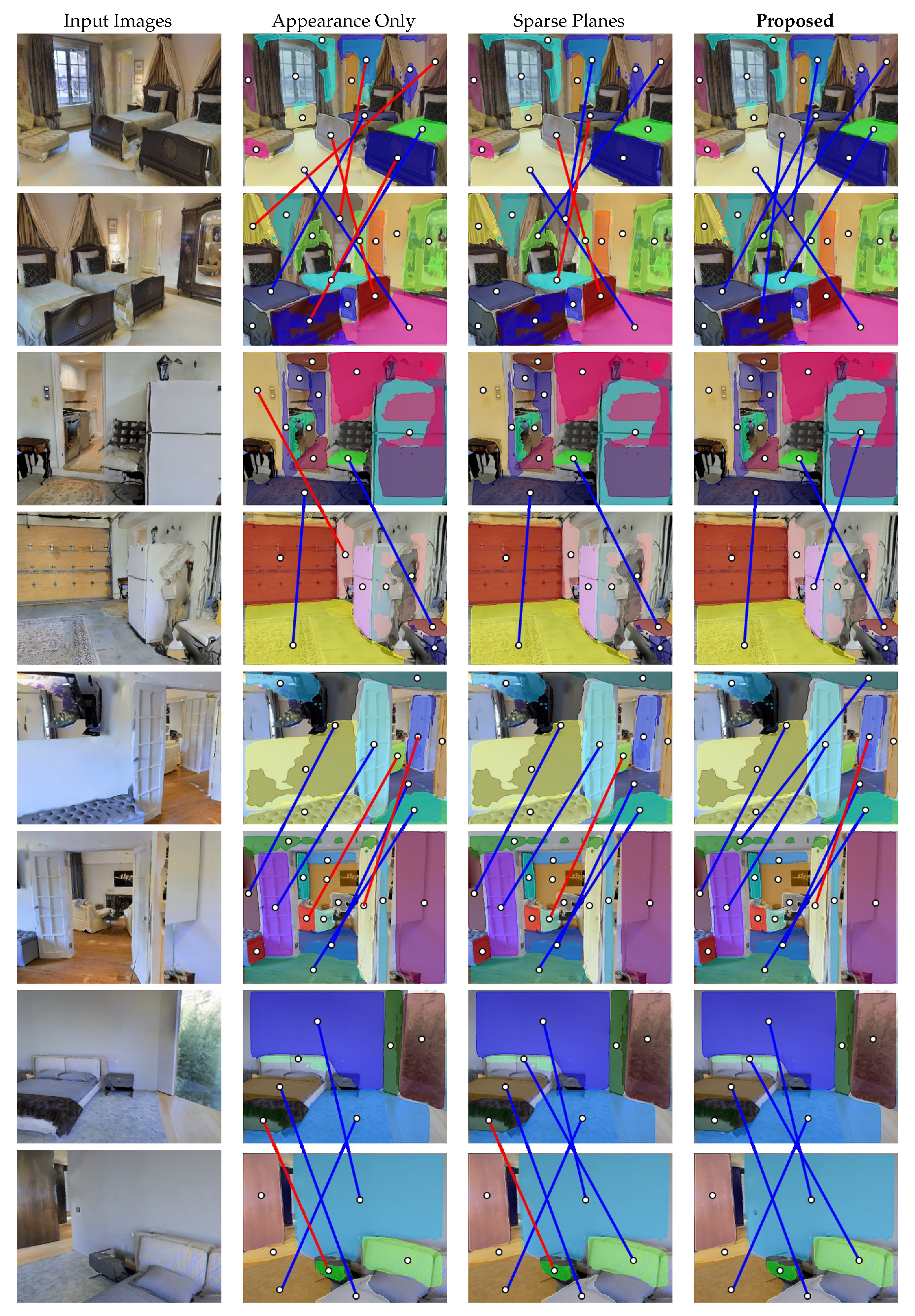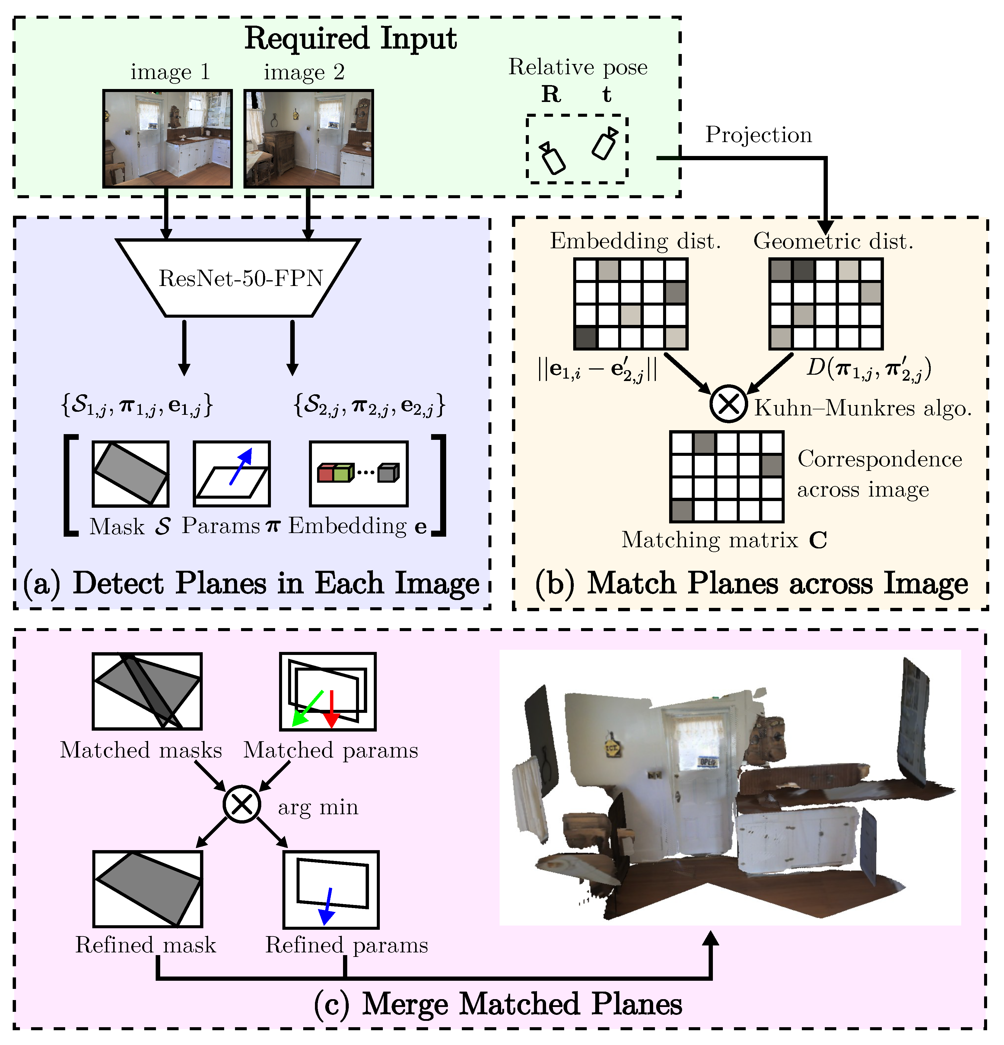 - We present a method for matching cross-view plane segments that utilizes appearance embedding and geometric features.