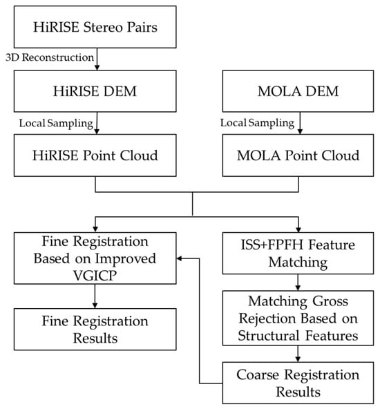 Since 1975, humans have conducted numerous Mars exploration missions [1], yielding a wealth of images and topographic data. The key challenge in Mars mapping using multi-sensor and multi-source data lies in addressing the spatial reference data issue. In deep space photogrammetry, systematic errors in satellite orbital position parameters, typically stemming from planetary orbiter clock errors, star sensor measurement errors, and the Doppler effect, often range from hundreds to thousands of meters. Moreover, due to the low accuracy of satellite attitude orbit measurement data and the absence of control points on the planetary surface, Mars surface models reconstructed directly from satellite images frequently exhibit significant absolute offsets [2]. Previous studies [3,4,5,6,7] have demonstrated that Mars Orbiter Laser Altimeter (MOLA) [8,9] data can aid in the geometric positioning of Mars photogrammetry. The MOLA Digital Elevation Model (DEM) serves as an excellent global control reference for determining orbit and attitude parameters in Mars exploration missions and mapping endeavors [10]. By employing the MOLA DEM’s results as the reference data, a large number of matching approaches were widely developed to further align the topography information from images and point cloud.