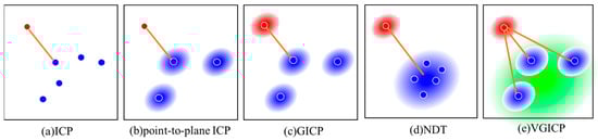 Building upon feature coarse registration, accurate correspondence between point clouds is achieved by minimizing the point-to-point distance metric function. The classical Iterative Closest Point (ICP) algorithm [24] determines the optimal transformation between point clouds by minimizing the distance from each source point to its nearest neighbor in the target point cloud, enabling point-to-point registration. However, this method is sensitive to gross errors and resolution disparities. In contrast, the point-to-plane ICP [46] minimizes the distance from each source point to the plane where the corresponding target point is located, leveraging spatial information from the neighborhood of the target point for point-to-distribution registration. This approach exhibits faster convergence and greater resistance to gross errors compared to traditional ICP, but it does not consider the local information of the source point, making it challenging to handle mismatches caused by gross errors in the source point cloud. The Generalized Iterative Closest Point (GICP) algorithm [47] addresses these limitations by weighting the distance loss based on both the local geometric information of the source and target points, achieving distribution-to-distribution alignment. GICP outperforms both point-to-point ICP and point-to-plane ICP in terms of registration accuracy and robustness. Another approach, the Normal Distributions Transform (NDT) algorithm [48], voxelizes the target point cloud before matching and determines the optimal transformation by maximizing the response value of the probability function corresponding to the projection of the source points onto the target voxel distribution. NDT operates as a voxel-based point-to-distribution method. However, NDT is often highly sensitive to the choice of voxel resolution, and its registration accuracy tends to be lower than that of ICP methods. The geometric interpretation of the distance cost associated with these methods is illustrated in Figure 5.