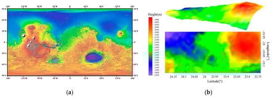 The experimental data include Mars Orbiting Laser Altimeter (MOLA) DEM and HiRISE DEM. MOLA DEM is a digital elevation model covering the globe of Mars based on MOLA data carried by NASA MGS, with a horizontal positioning accuracy of 100 m, an elevation accuracy of 3 m, and a pixel resolution of 463 m. Global MOLA DEM images use a simple cylindrical projection with a size of 23,040 × 46,080 pixels (Figure 7a). In this paper, the target point cloud was generated by resampling the DEM images within the study area (longitude 19.15°W~18.94°W, latitude 23.74°N~24.19°N), and the sampling resolution was 16 m in order to ensure the point cloud order of magnitude was consistent with HiRISE DEM (as in Figure 7b).