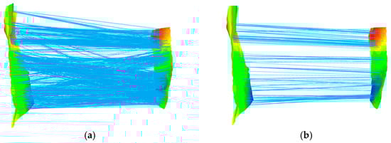 Key points matching results. (a) FPFH feature matching; (b) optimization based on graph matching. The initial feature matching contains numerous mismatches (a), but after applying graph matching to remove gross errors, the remaining matches are correct (b).
