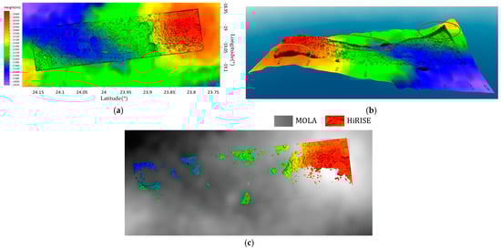 The High Resolution Imaging Science Experiment (HiRISE) is a high-resolution imaging instrument carried by the Mars Reconnaissance Orbiter (MRO), capable of capturing ultra-high-resolution images of the Martian surface with a resolution of 0.25 m. It currently stands as the highest resolution camera for Mars exploration. The HiRISE has been proven to be highly effective in conducting local sub-meter terrain reconstruction and exploring geomorphology on Mars [2,10], playing a crucial role in studying the landing sites of missions such as Spirit [26] and Curiosity [27]. For precise positioning, the attitude orbit of HiRISE data should be calibrated by MOLA orbit data [28]. The DEM registration allows for the alignment of orbit data, combining HiRISE’s high-resolution capabilities with MOLA’s extensive coverage. This integration enables detailed analysis of Martian surface features, essential for geological studies, navigation, and planning. The process also aligns discrepancies in coordinate systems, ensuring accurate data comparison and analysis.