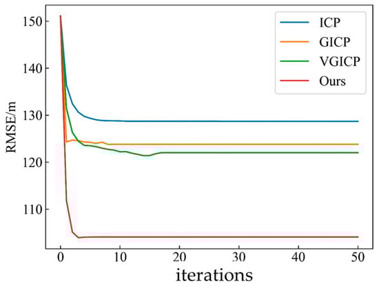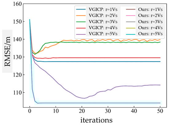 Meanwhile, in order to verify the stability of the selection of voxel radius r, a comparison experiment with VGICP was designed by taking r = {Vs, 2Vs, …, 5Vs}, and the number of iterations as 50. The variation in the RMSE index with the number of iterations is shown in Figure 14, and the statistical results are shown in Table 4.