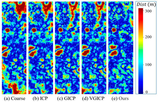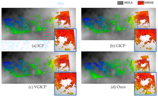 By comparing the accuracy metrics in Table 2 and Table 3, it can be seen that all four of the above fine registration algorithms can improve the coarse registration results, which is consistent with the results in Figure 12. At the same time, the performance of our method was better than the other three comparison algorithms in all of the evaluation indexes, and the mean value of the statistical pointing error of the grid δTM was reduced to below 80 m, and the number of LCP common points with MOLA DTM also significantly increased. As shown in Figure 10, compared with the existing best-performing VGICP algorithm, our algorithm converges faster and the RMSE is reduced by nearly 20%, which can achieve a high accuracy and high efficiency of HiRISE DEM absolute positioning. The final top view of the point cloud registration is shown in Figure 13. In terms of visual effects, the pixel ratios of the MOLA DEM and HiRISE DEM are the most similar in the top view corresponding to our method, and the distribution is more random, which means that the terrain fits better and the inconsistency of the registration results reflects the difference in the resolution ability of the terrain itself more rather than the gross errors in the registration.