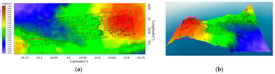 The HiRISE DEM was generated by the Mars orbit image photogrammetry processing software developed by our team. This software was developed in the C + + language and has functions such as line-array image intensive matching, jitter correction, bundle block adjustment, etc. The generated DEM achieves a sub-pixel accuracy in terms of back projection error. The HiRISE stereo image pairs are PSP_008469_2040 and PSP_008825_2040 from the Mawrth Vallis area (Figure 8a) with a ground resolution of 0.25 m. Due to the large amount of data, the experiments in this paper use a uniform grid of 64 × 64 pixels to extract the thinning and perform a semi dense surface reconstruction to obtain the HiRISE DEM grid with 16 m resolution (as in Figure 8b).
