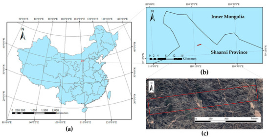 The study area is the Shendong Mining Area, which is close to Ordos City, Inner Mongolia, China (Figure 1). The average annual temperature and precipitation of the area are about 8.5 °C and 300–400 mm, respectively. The average elevation of the area is around 1250 m, with significant terrain fluctuations; the region has a typical arid and semi-arid plateau continental climate. The study area has an east–west length of approximately 2 km and a north–south width of about 300 m, covering an area of approximately 0.6 km2. Situated in the transitional zone between grassland and forest steppe, the original vegetation types include deciduous trees, shrubs, sandy-soil vegetation, and grassland.