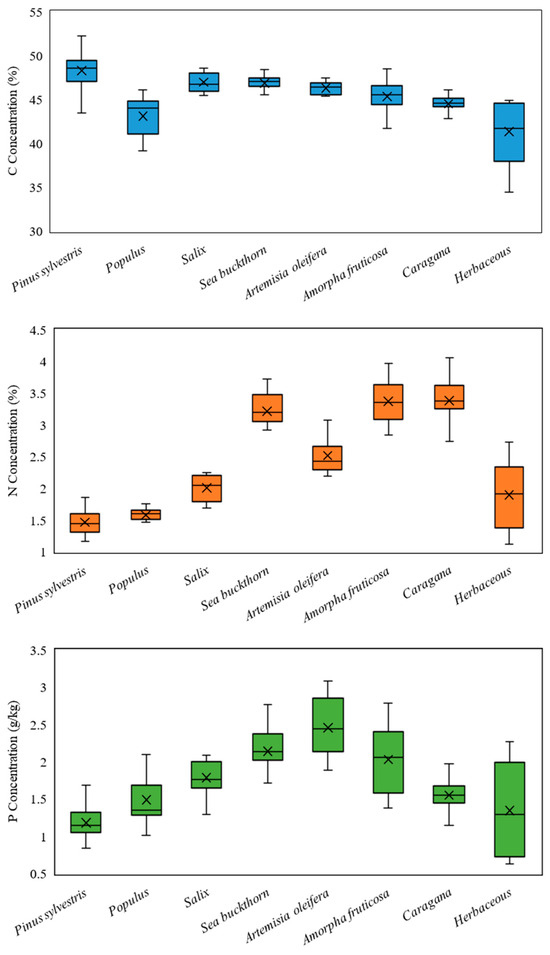 Figure 2 shows the C, N, and P concentrations of eight dominant plant communities including the Pinus sylvestris, Populus spp., Salix spp., Sea buckthorn, Artemisia oleifera, Amorpha fruticosa, Caragana spp., and Herbaceous spp. communities. No significant difference in C concentration was observed among the eight dominant plant types. Among them, Pinus sylvestris exhibited the highest C concentration, while the Populus spp. and Herbaceous spp. communities showed slightly lower C concentrations. Considerable variations were observed for N and P. Amorpha fruticosa and Caragana spp. demonstrated relatively high N concentrations, while Pinus sylvestris, Populus spp., and Herbaceous spp. had lower N concentrations. Artemisia oleifera showed the highest P concentration, while Pinus sylvestris and Herbaceous spp. had lower P concentrations.
