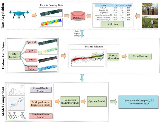 Figure 3 illustrates the technical roadmap for foliar C, N, and P mapping by using UAV-based LiDAR and hyperspectral data, combined with ground sampling data. The Boruta algorithm was used to select features and construct three models including causal bands (namely, causal absorption features (nm) related to foliar biochemicals including C, N, and P, multiple linear regression, and random forest. The model with the highest accuracy was used to map the foliar C, N, and P in the study area.