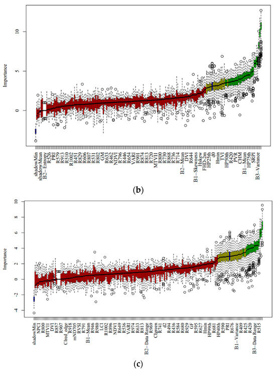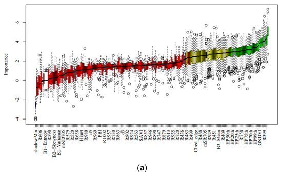 The feature selection results are shown in Figure 4. The blue box plot corresponds to the minimum, mean, and maximum Z scores (importance) of the shadow features. The red, yellow, and green box plots represent the Z scores for the rejected, tentative, and confirmed features, respectively. In this study, important variables (green box) were picked out as the input variables for modeling.